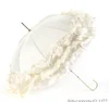 Umbrella ID 437 | Ivory Pagoda with Gold Trim and White Fringe | Clear Lucite Hook Handle | Bella Umbrella | Vintage Umbrella Rentals